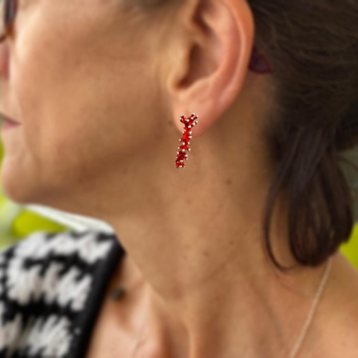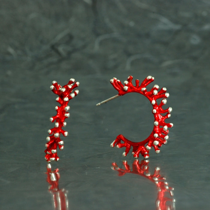 Estos pendientes de presión, con forma de aro y anémona, están elaborados en plata de Ley 925 y presentan un acabado galvanizado en rojo pasión con las puntas pulidas en brillo.