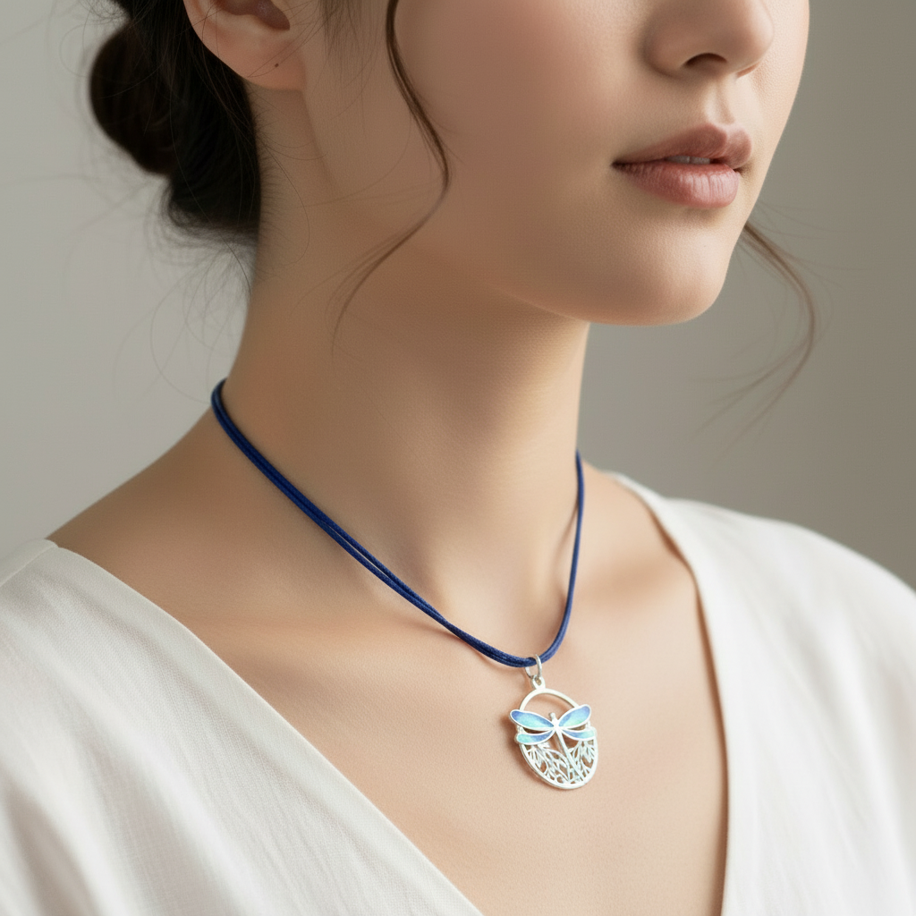Este colgante pequeño, redondo, Art Nouveau de Ardentia presenta una delicada libélula en plata de Ley 925, adornada con esmalte al fuego.