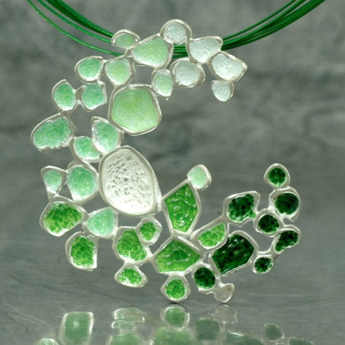 Este colgante grande, con esmalte al fuego, de la colección Dream de Ardentia está elaborado en plata de Ley 925, destacando por su diseño moderno y sofisticado. La pieza presenta un acabado meticuloso con vibrantes detalles de esmalte al fuego en tonos verdes, que realzan su elegancia y singularidad, convirtiéndolo en un accesorio distintivo y llamativo.