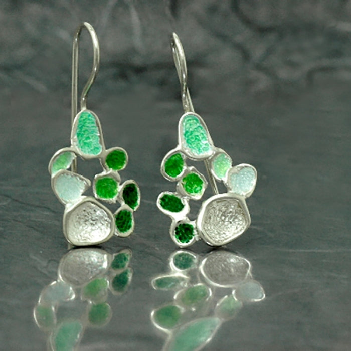 Pendientes de gancho fijo, con texturas, en plata de Ley 925, con esmalte al fuego en varias tonalidades de verde.