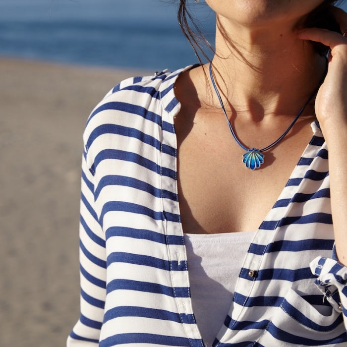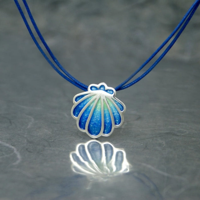 Colgante en forma de concha de Santiago de Compostela, en plata de Ley 925 con esmalte al fuego en varias tonalidades.