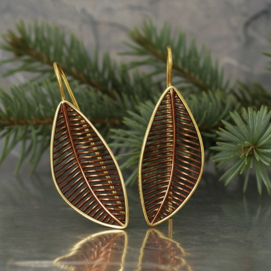 Pendientes de gancho fijo, realizados en plata de Ley 925, con acabado galvanizado marrón chocolate en su interior, dejando los bordes pulidos brillo, con un acabado chapado en oro.