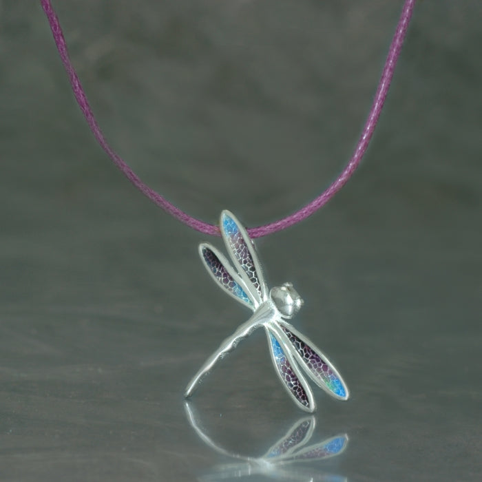 Colgante con silueta de líbélula, en plata de Ley 925, con esmalte al fuego en varias tonalidades (azul, morado o verde botella) que lleva un elegante degradado.