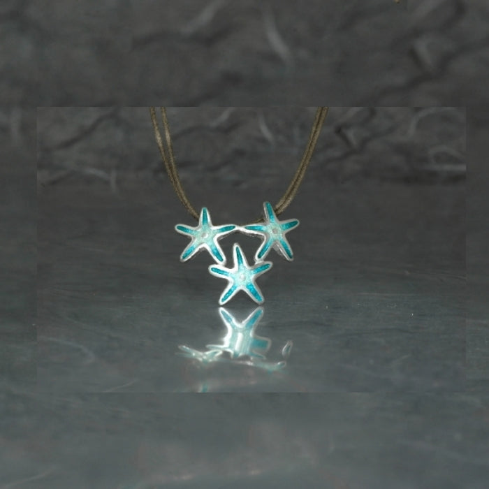 Colgante de triple pieza, en plata de Ley 925, con esmalte al fuego en varias tonalidades. El delicado degradado del esmalte al fuego es visible en cada una de las estrellas, del centro a las puntitas.