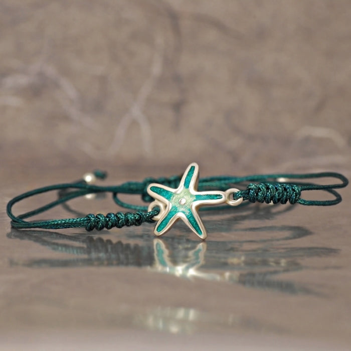 Pulsera de la colección Mare, con una estrella en plata de Ley 925 y esmalte al fuego, montada en en macramé de hilos de nailon.