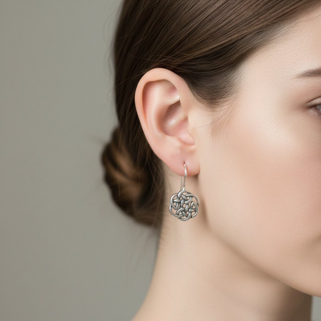 Pendientes de gancho fijo, de la colección Nudo Celta. Realizados en plata de Ley 925, se entregan con unos topitos de silicona, para evitar posible pérdida de los pendientes.