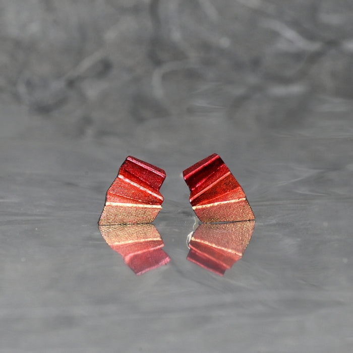 Pendientes de presión, de la colección Origami (con forma de papiroflexia), en plata de Ley 925 con acabado de pátina y pigmentos con efecto metálico, color rojizo irisado.