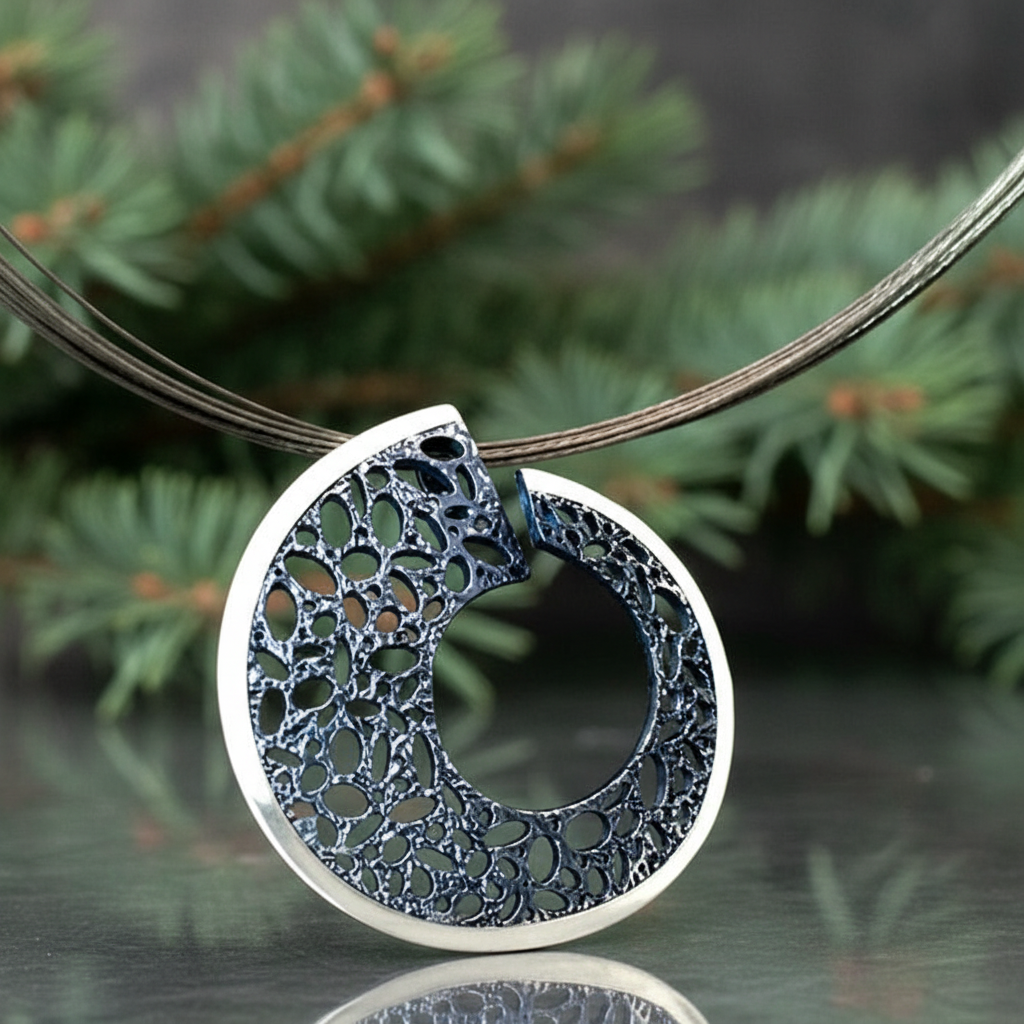 Colgante Oslo, en círculo abierto, con la anilla oculta en la parte de atrás, para pasar discretamente el cordón de cortesía que enviamos.